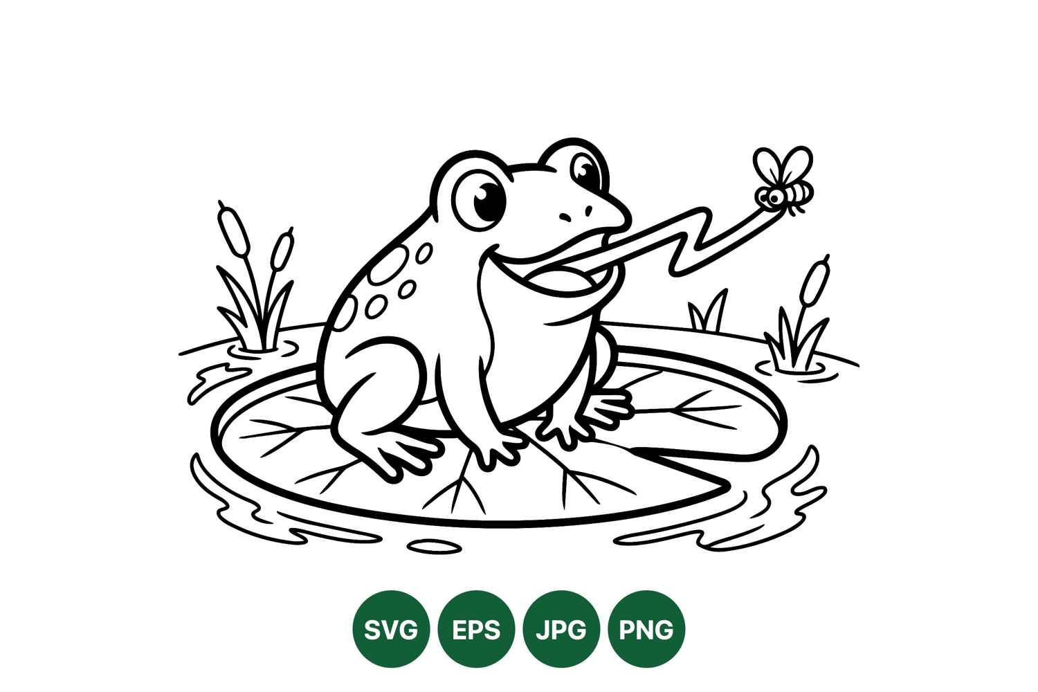 A cheerful cartoon frog sits on a lily pad extending its long tongue to catch a buzzing insect near cattails and water ripples in a simple black and white line art style