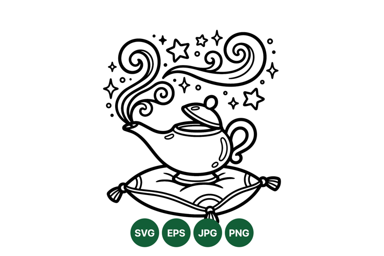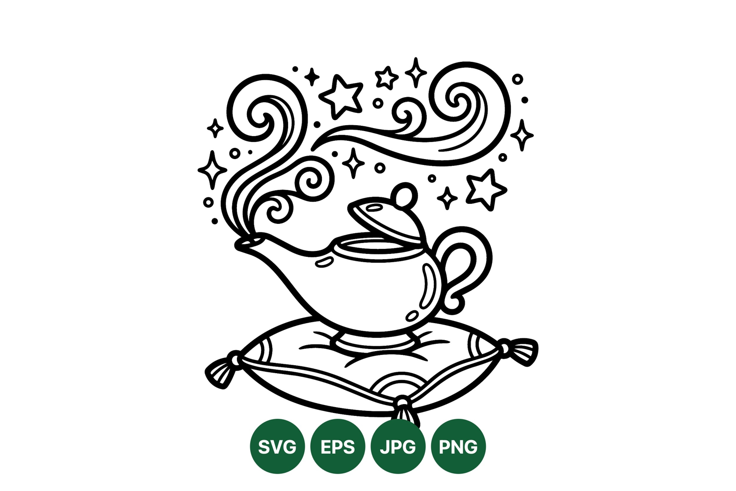 A black line art vector illustration shows a magic lamp emitting swirling smoke and sparkling stars while resting on a decorated cushion, evoking a mystical and whimsical mood