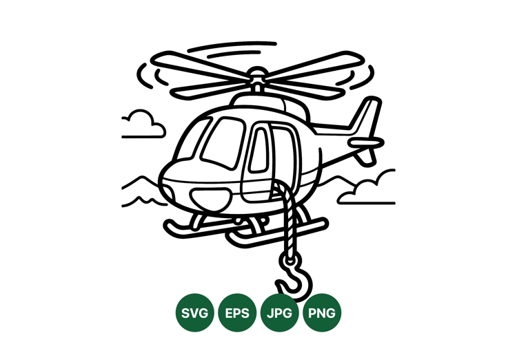 A simple black and white line drawing depicts a helicopter with spinning rotor blades and a dangling hook flying over mountains with clouds in the background in a minimalist style.