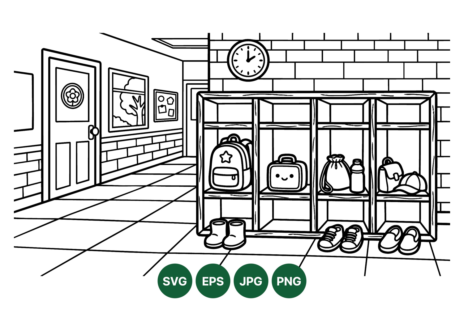 A black and white line art vector shows a school hallway with cubbies filled with backpacks lunchbox shoes and water bottle under a clock window view outside peaceful mood