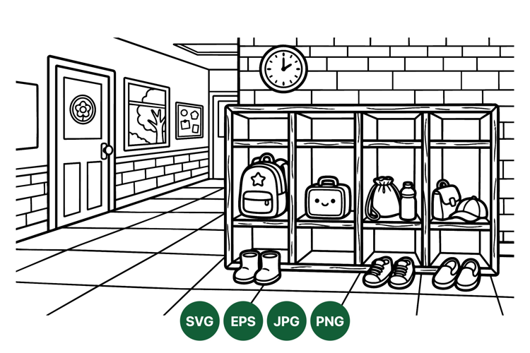 School Supplies Clipart Black And White Svg Line Art School Design School Hallway Illustration School Locker Clipart Svg School Interior Vector School Drawing Kids Backpack Artwork School Shoes Illustration School Clock Graphic