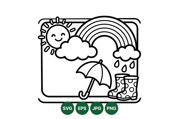 A cheerful black and white vector depicts smiling sun clouds forming a rainbow with raindrops umbrella and polka dot rain boots in a playful style suitable for coloring or educational use peaceful