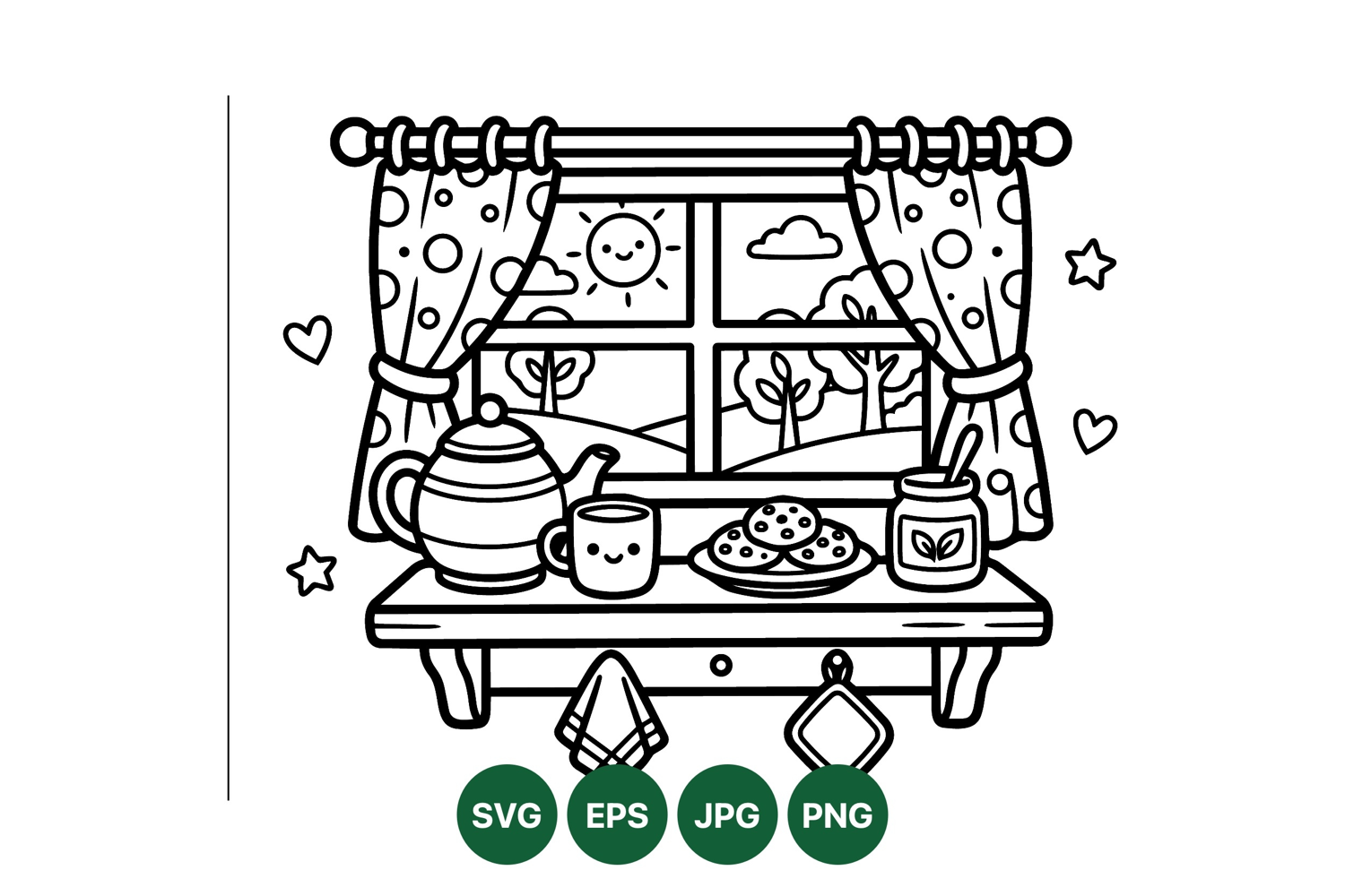 Black and white line art shows a cozy kitchen window with curtains tea smiling cup cookies and honey jar overlooking a sunny landscape minimalist vector style peaceful vibe