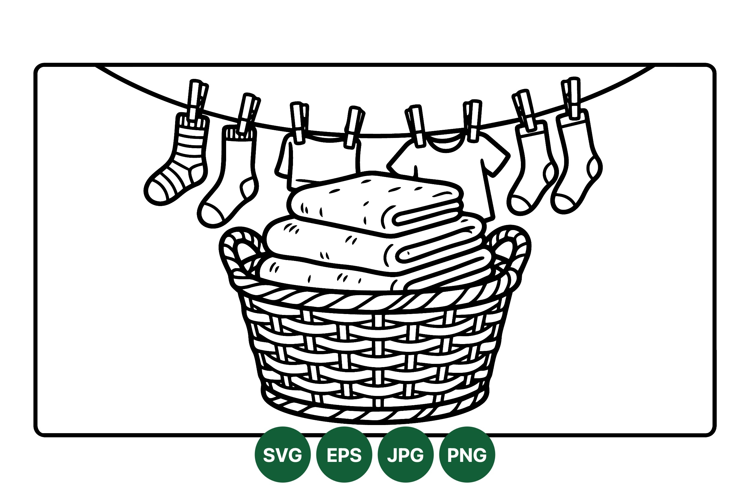 Black and white line drawing shows a woven laundry basket filled with neatly folded towels while socks and shirts hang on a clothesline secured by clothespins in a clean simple style