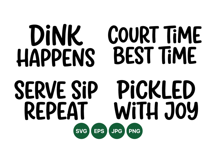 Playful handwritten style text quotes including dink happens court time best time serve sip repeat and pickled with joy in casual black lettering emphasizing fun and joy.