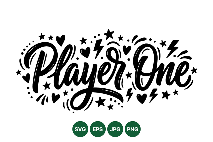Bold hand lettering spells player one surrounded by stars hearts and lightning bolts this black and white vector art design conveys playful and energetic mood suitable for digital and print projects