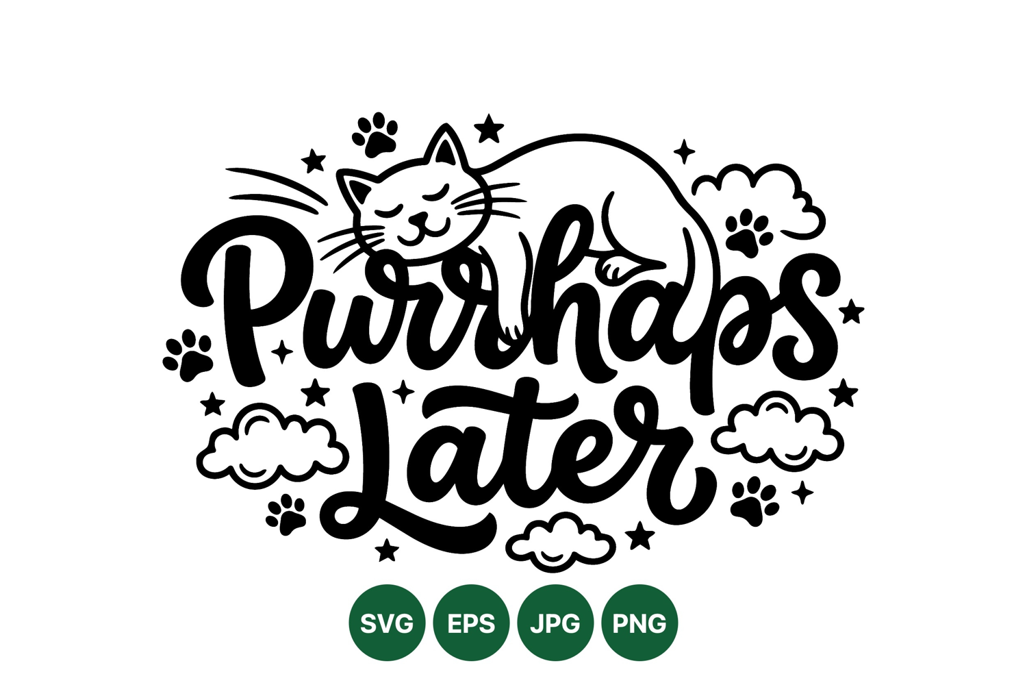 A sleeping cat rests contentedly over stylized handwritten phrase purrhaps later decorated with playful clouds stars and paw prints in black and white vector style peaceful and charming.