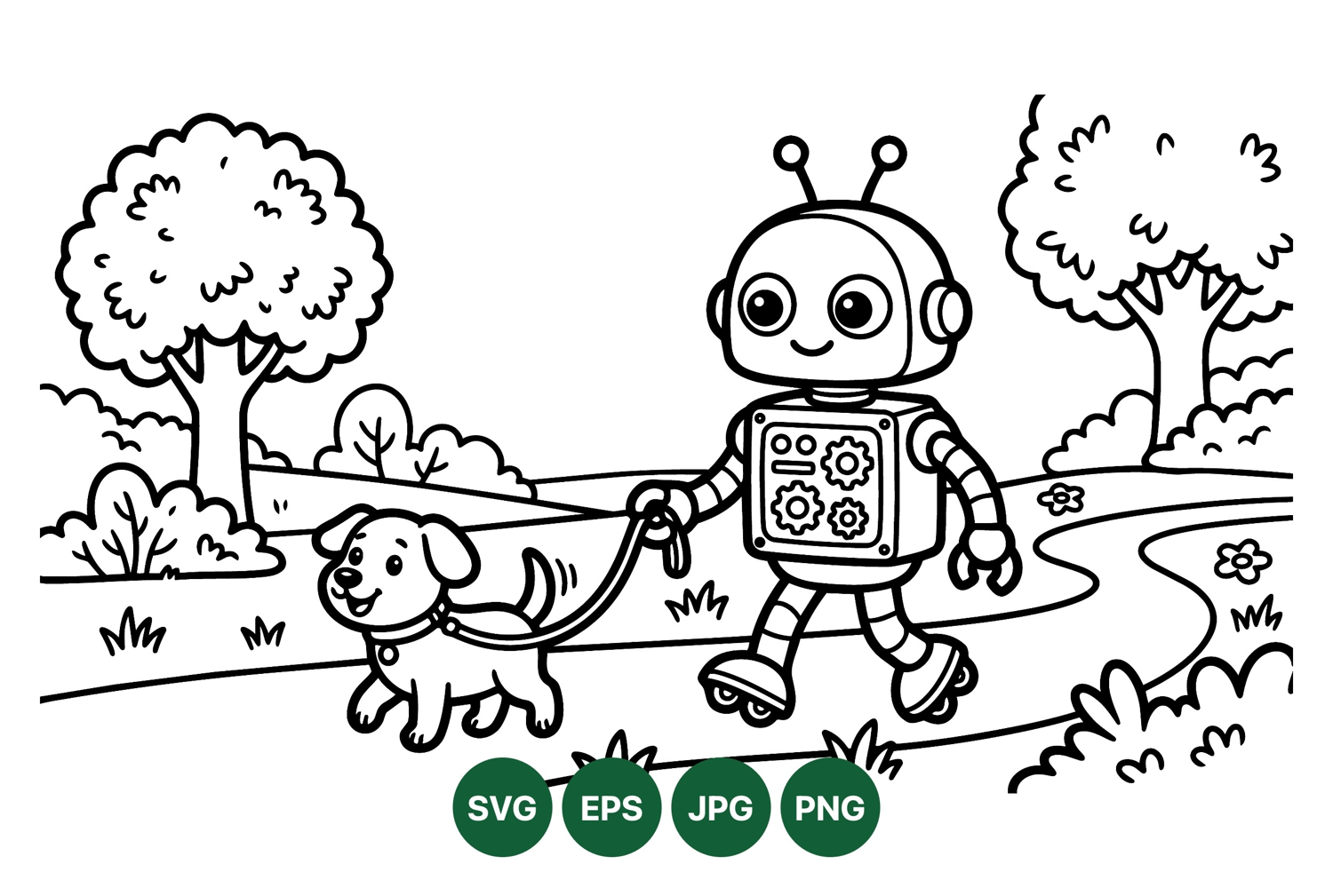 Vector Animal Illustration Dog Leash Vector Black Line Art Children Activity Clipart Childrens Coloring Page Robot Walking Dog Friendly Robot Design Cute Cartoon Robot Playful Pet Drawing Outdoor Park Scene