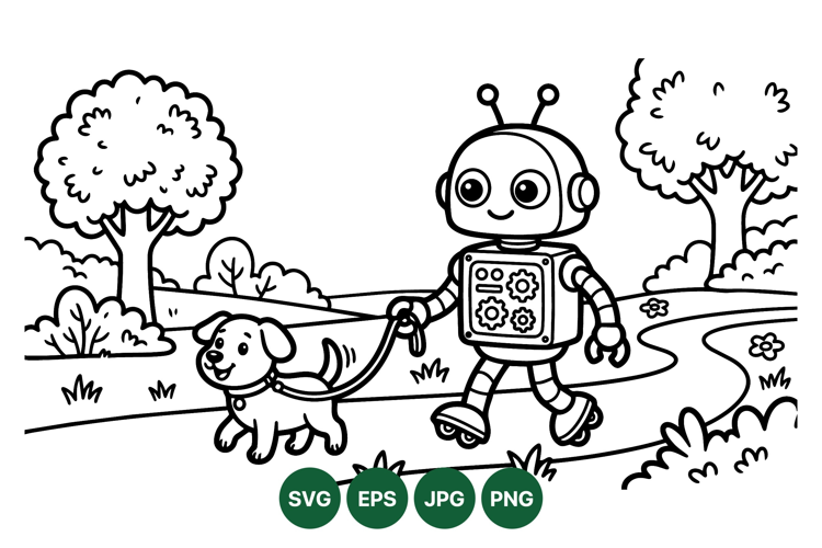 A cheerful robot holds a leash walking a happy dog along a winding park path surrounded by trees and flowers in playful cartoon line art style.