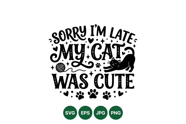 Playful black cat stretches near yarn ball with decorative paw prints hearts and stars surrounding humorous quote about being late pet lover style cheerful mood