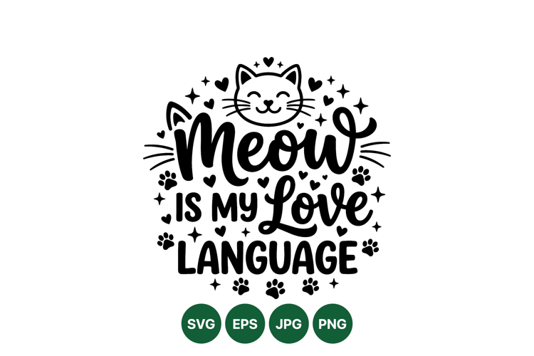 A charming black and white illustration features a smiling cat face with paw prints and hearts framing the phrase meow is my love language in bold lettering conveying affection and cuteness.