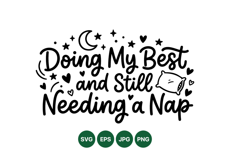 Playful handwritten typography stating doing my best and still needing a nap surrounded by moon stars hearts and a pillow symbol in simple black line art style expressing tired yet determined mood