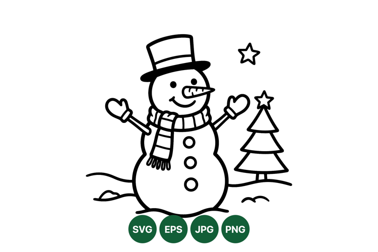 Cheerful snowman with scarf top hat and mittens stands near a decorated christmas tree under stars in a simple black and white line art style perfect for seasonal designs and coloring books.