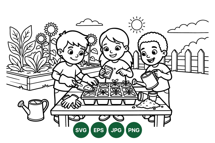 Three children work together planting seeds and watering green sprouts in outdoor garden boxes under a sunny sky with clouds and fence in background peaceful activity