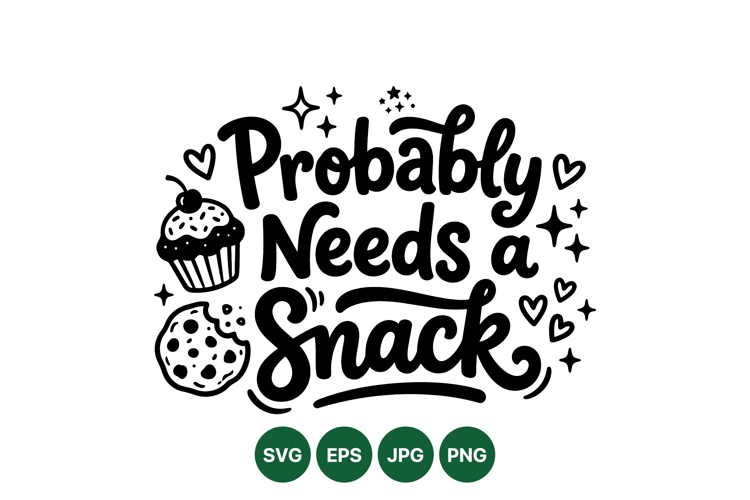 A playful black and white hand lettering phrase probably needs a snack surrounded by cupcake cookie hearts and sparkling stars in a decorative style illustration.