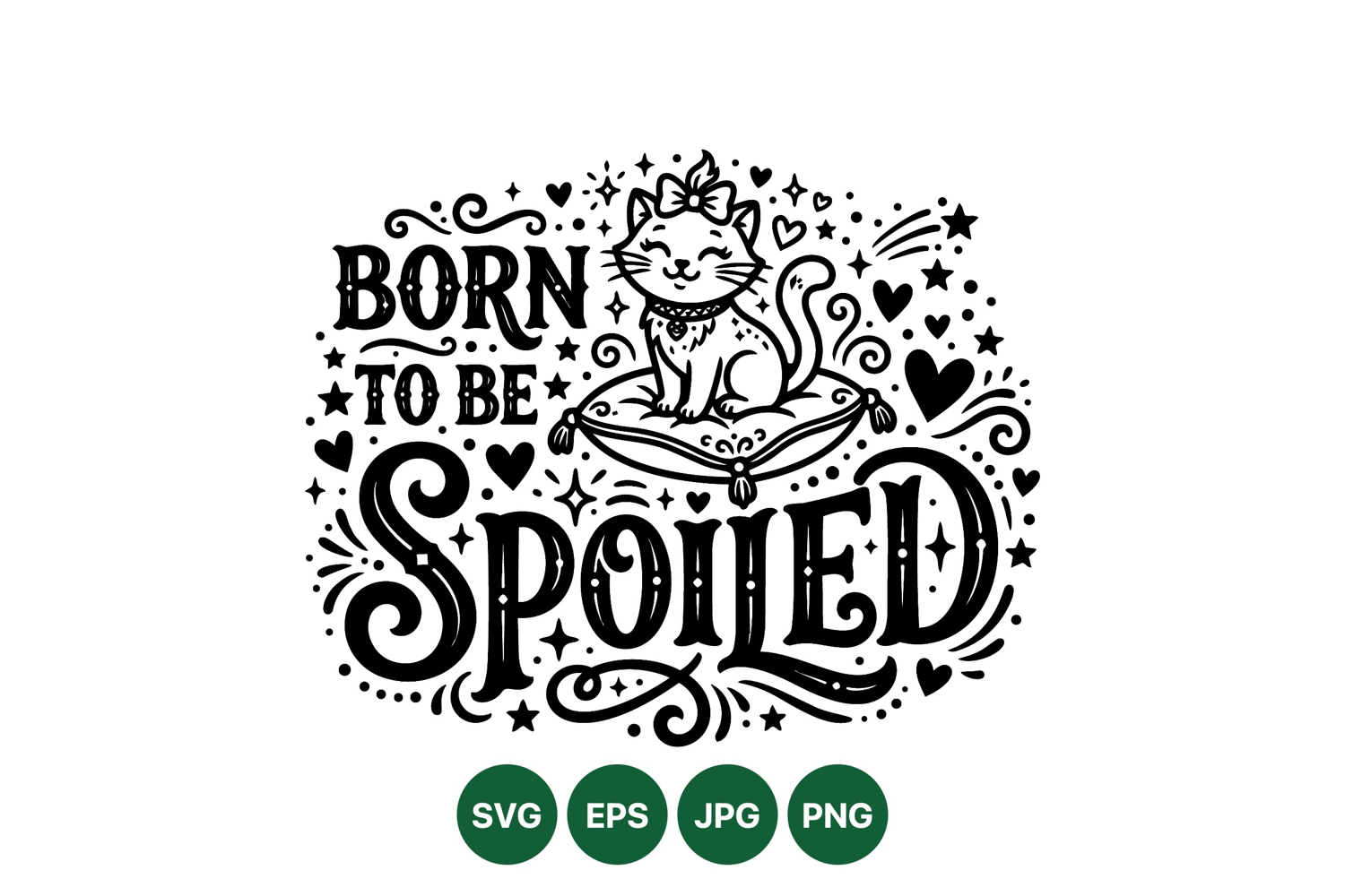 Whimsical line art features a smiling cat wearing a bow sitting on a cushion surrounding decorative hearts and stars with playful born to be spoiled typography in black and white