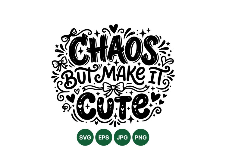 A whimsical hand lettered phrase chaos but make it cute surrounded by hearts stars bows and decorative doodles in black and white vector style ideal for prints and social media vibrant.