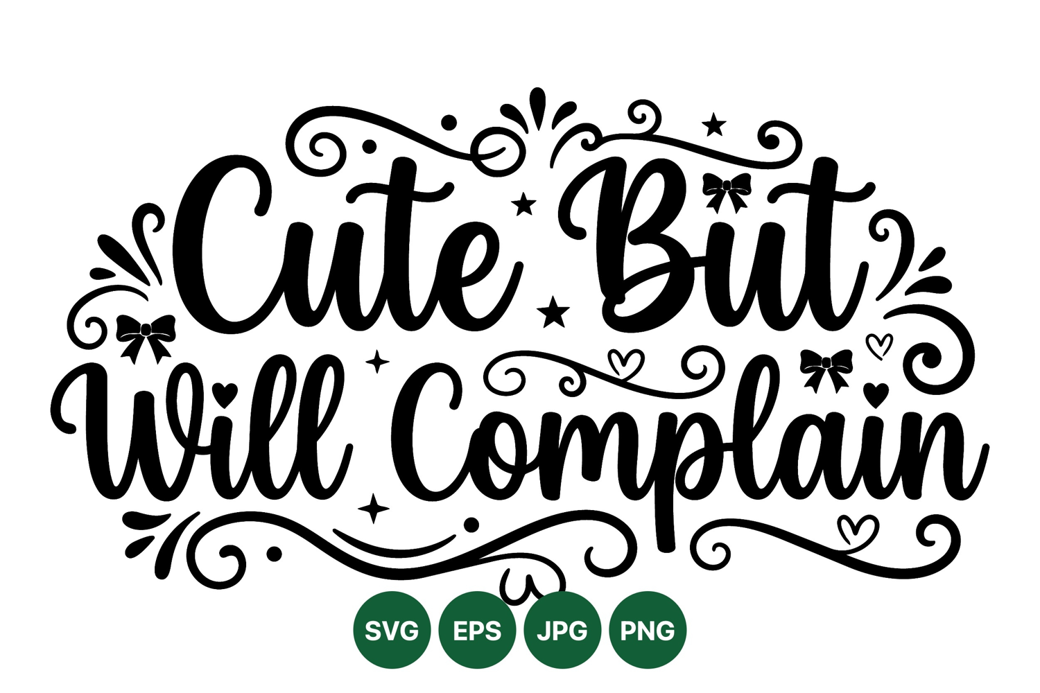 Whimsical hand lettering design reading cute but will complain features decorative swirls bows and hearts in black and white vector style suitable for print or digital use playful mood