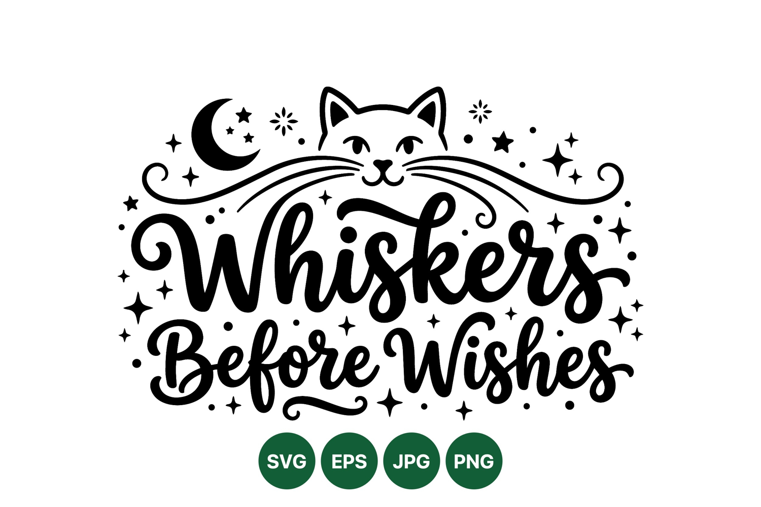 A charming black and white vector design featuring a cat face with long whiskers, crescent moon, stars, and decorative script lettering conveying whiskers before wishes in playful style.