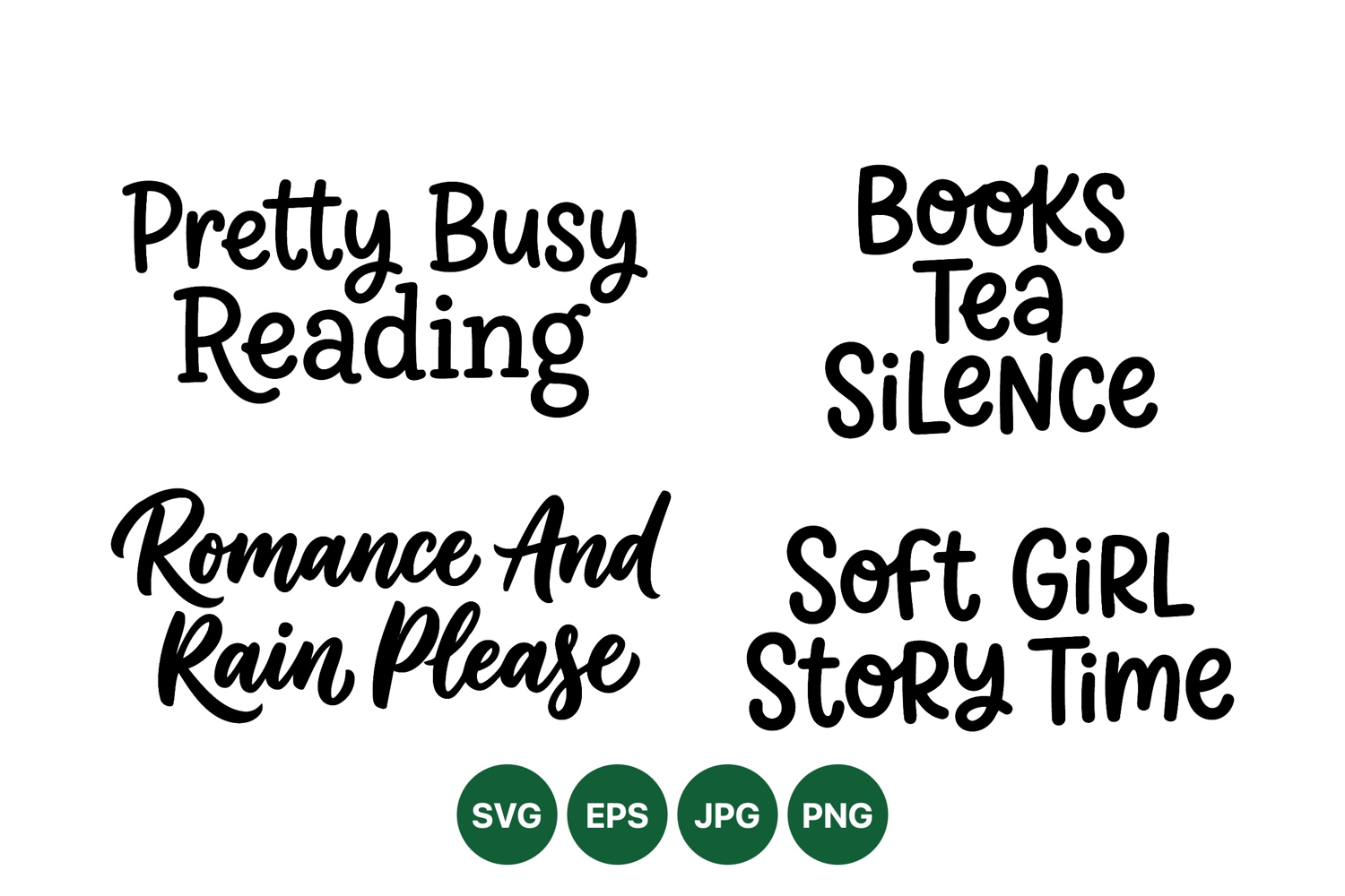 of black hand lettered reading and leisure themed quotes featuring playful script and casual fonts ideal for book lovers and cozy lifestyle projects.