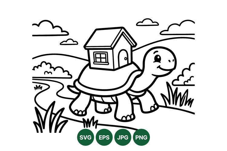 A cheerful turtle carries a small house on its shell while walking along a winding path under clouds in a simple black and white line art style perfect for coloring books and children illustrations.
