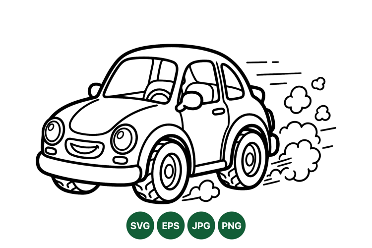 A cartoon style car with smiling face moves forward rapidly, illustrated in black and white outline with expressive motion lines and smoke, creating a fun and dynamic scene.