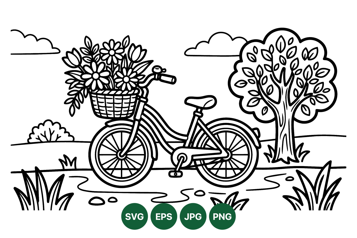 Spring Flower Clipart Hand Drawn Floral Line Art Illustration Nature Line Drawing Summer Flower Graphic Black White Outline Floral Bicycle Illustration Garden Bike Design Flower Basket Art Cute Bike Drawing