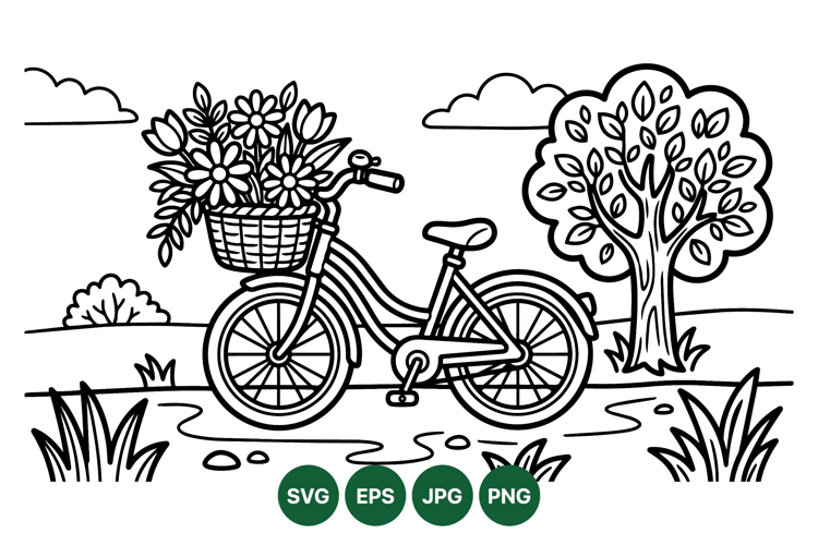 A black and white line art illustration depicts a bicycle with a flower basket on a countryside trail near a tree and bushes under clouds in a peaceful outdoor setting.