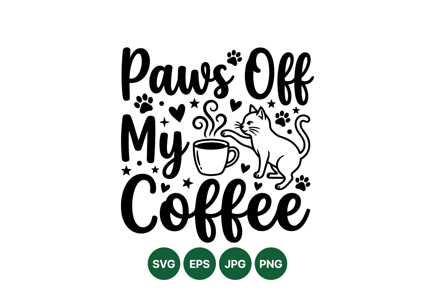 Playful black and white vector art features a cat pawing at a steaming coffee cup surrounded by hearts stars and paw prints with bold typography in a fun mood