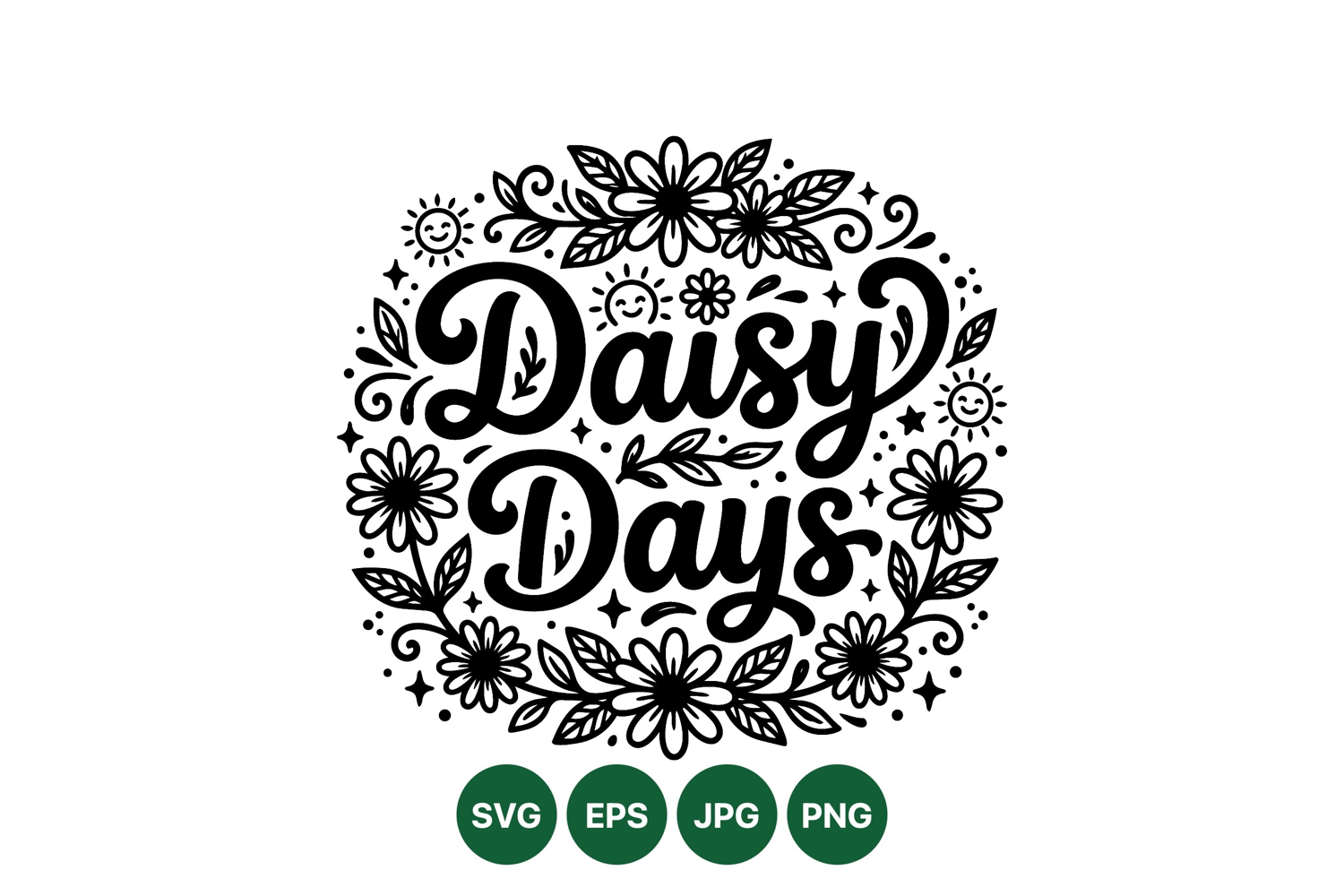 Intricate black and white vector illustration with hand lettering spelling daisy days surrounded by floral elements and smiling sun icons in a decorative circular frame style.
