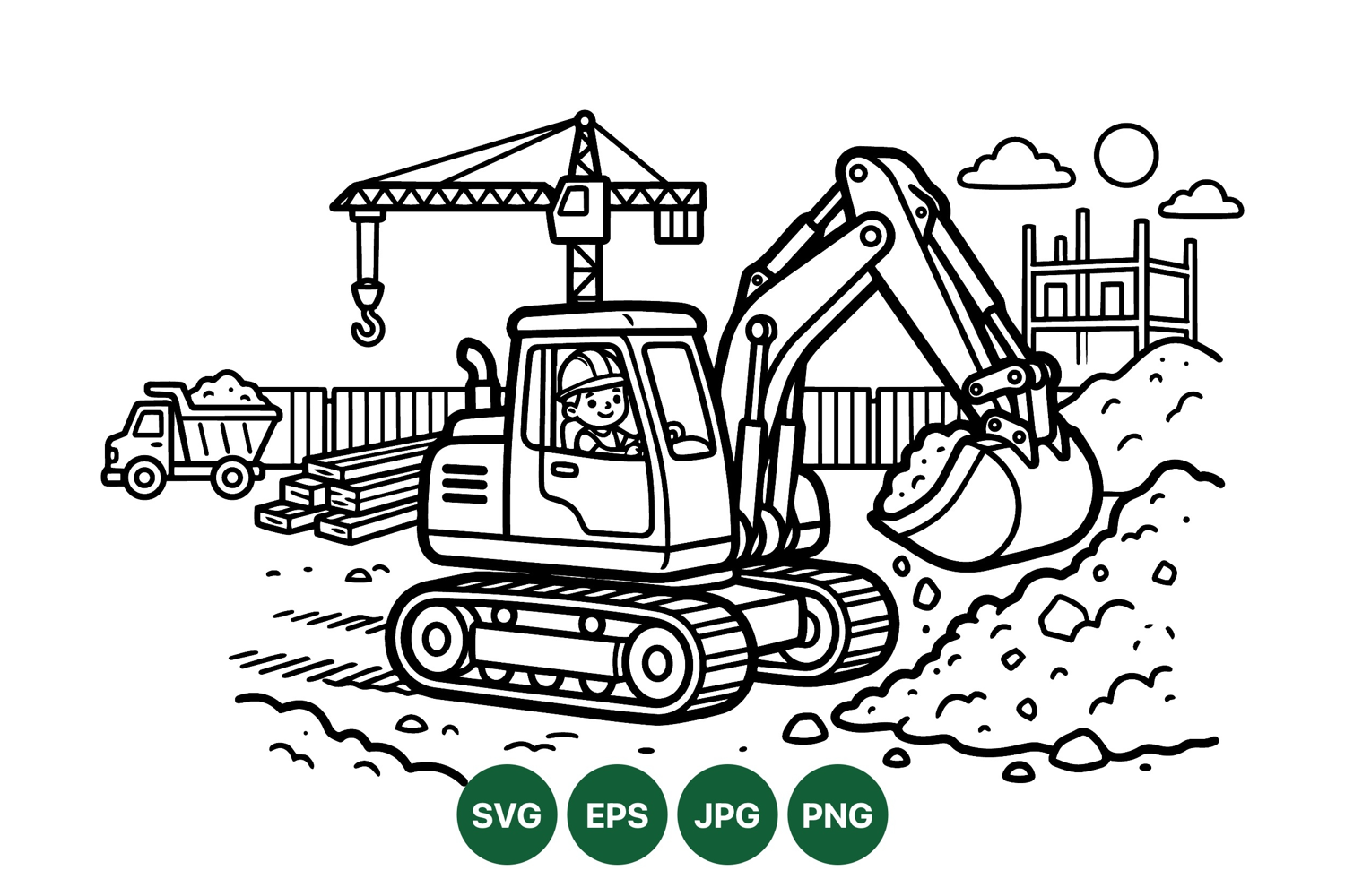 A cheerful worker operates an excavator at a construction site with crane, wood planks, and dump truck under a sunny sky, depicted in detailed black and white line art style.