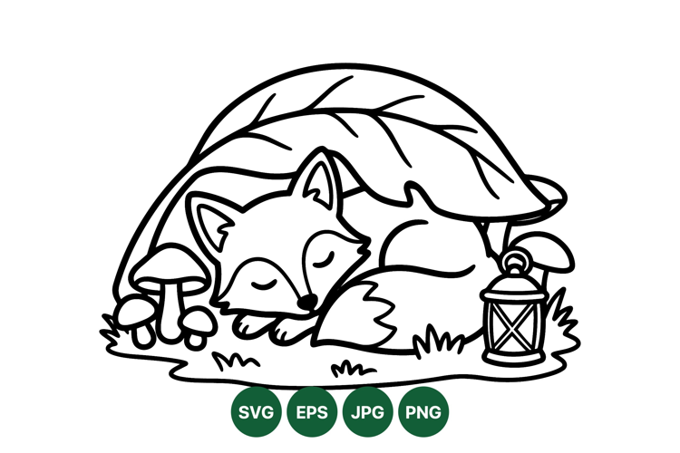 A charming black and white line art illustration shows a sleeping fox curled under a large leaf with surrounding mushrooms and an old style lantern creating a peaceful nature scene