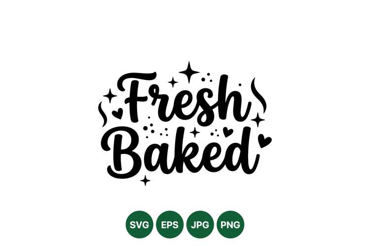 Hand lettering artwork displays the phrase fresh baked with decorative stars hearts and steam lines accentuating the message in a clean black and white style