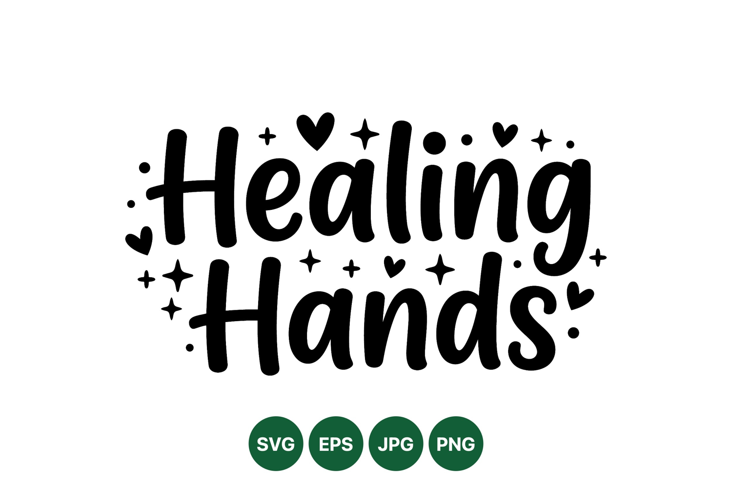 Playful hand lettering design shows the phrase healing hands with heart shapes and sparkle details in black on white background delivering a positive vibe and calm mood
