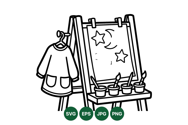Line art vector showing an artist easel with four paint brushes in jars and a hanging smock in front of a canvas featuring stars and moon symbols in a simple art style.