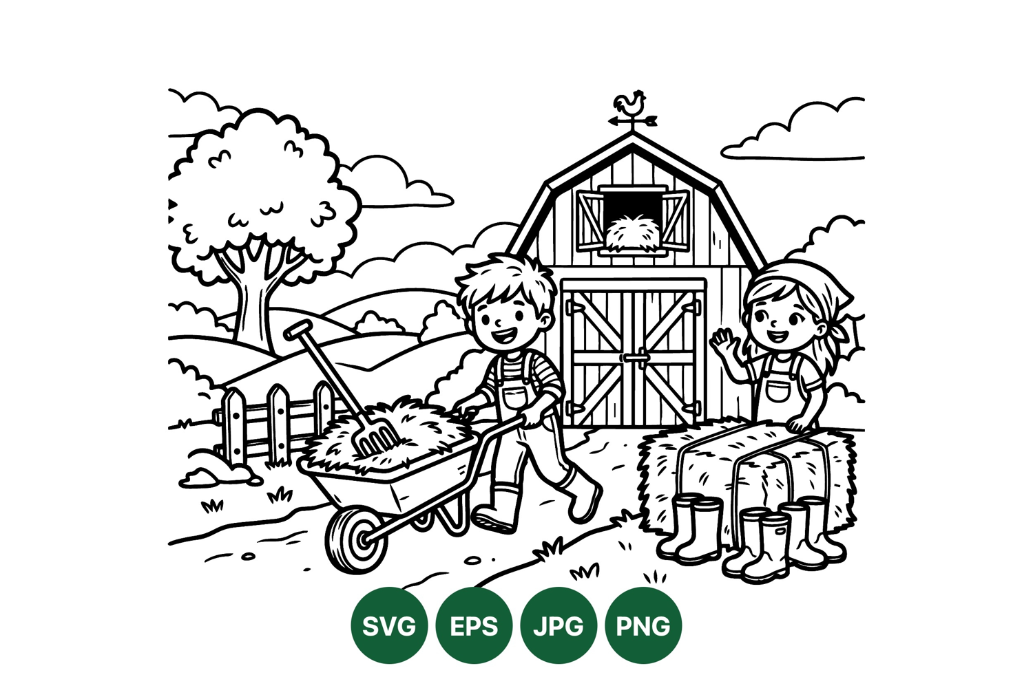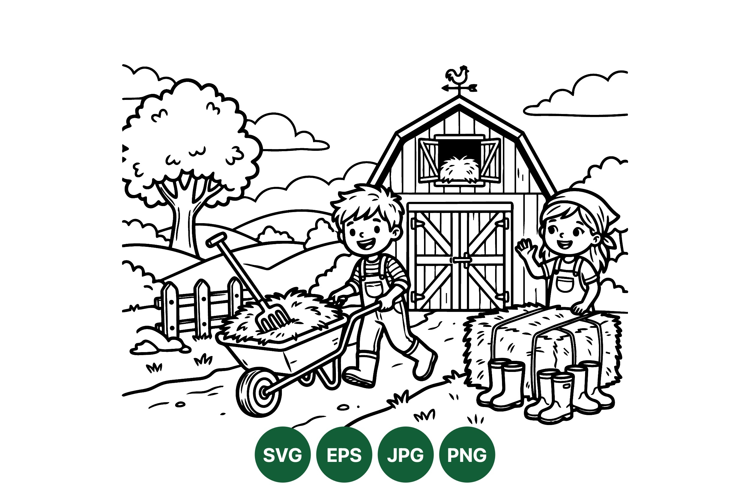 A charming black and white line art depicts two children working happily on a farm yard with a barn, wheelbarrow full of hay, fence, clouds, and boots near hay bales peaceful rural activity