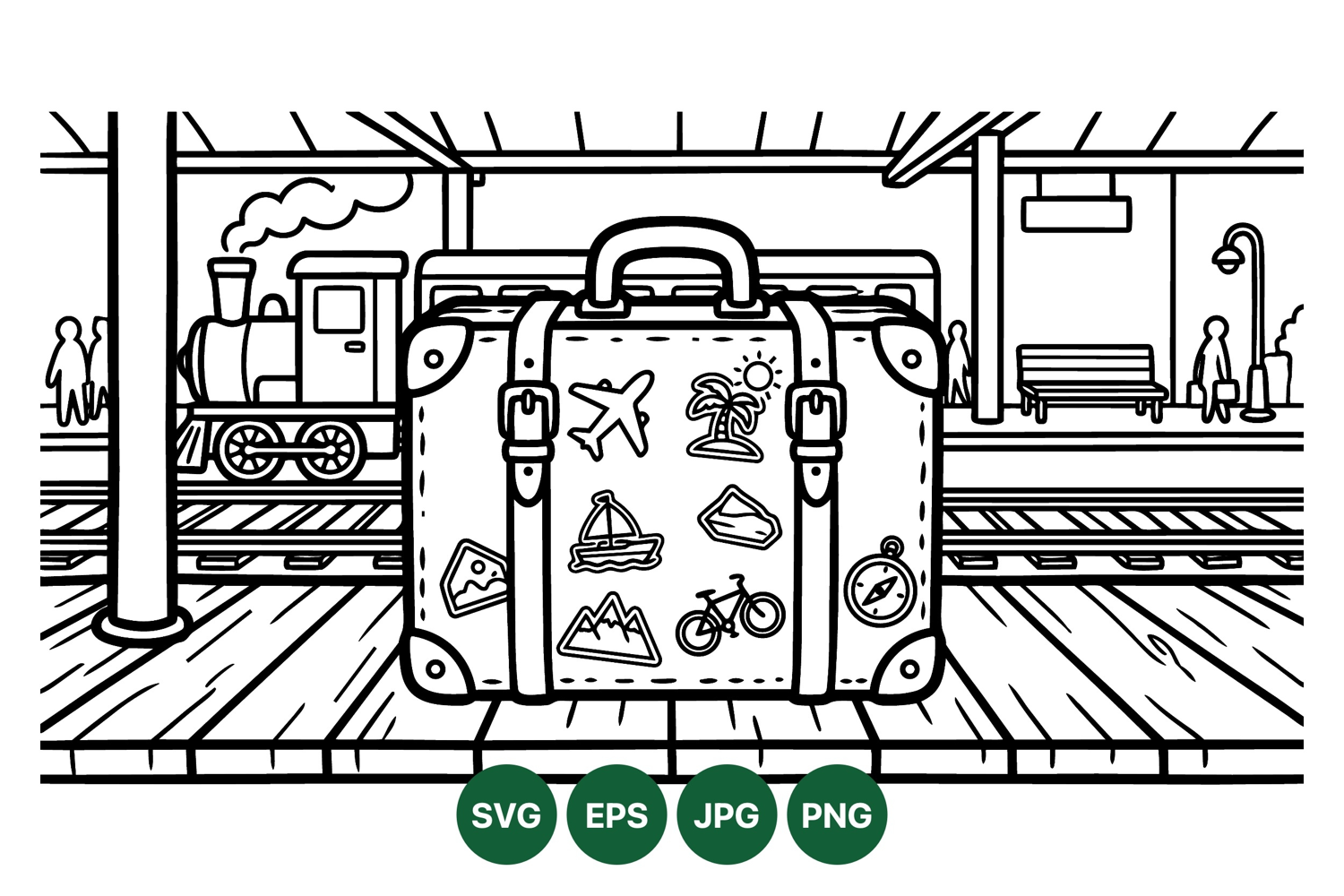 A detailed black and white vector line art depicts a travel suitcase with travel themed stickers at a busy train station platform with a vintage steam train and waiting passengers, minimalistic style