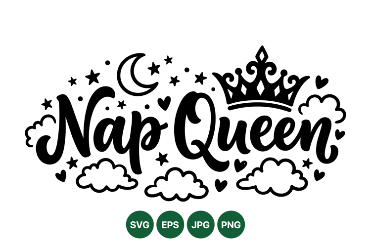 Hand Drawn Lettering Queen Crown Art Nighttime Svg Graphic Nap Queen Design Cute Sleep Clipart Cozy Nap Illustration Relaxation Shirt Design Moon Star Decoration Cloud Doodle Artwork Comfortable Sleep Design