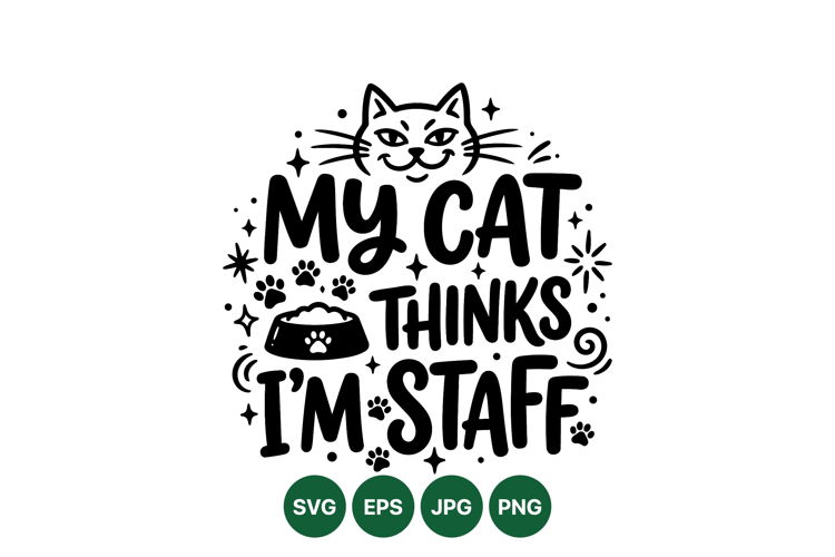 Playful black and white vector illustration shows a smiling cat head with text my cat thinks im staff surrounded by paw prints and star decorations creating whimsical mood