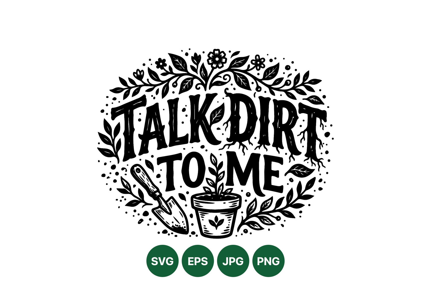 Hand drawn vector art features gardening quote talk dirt to me surrounded by leaves shovel and potted plant ideal for garden themed decor or apparel design charming style