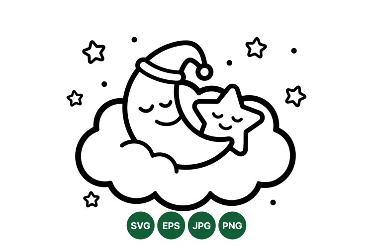 A calming vector line art shows a crescent moon in a sleeping cap hugging a content star on a soft cloud with tiny stars around it evoking peaceful bedtime and relaxation mood.
