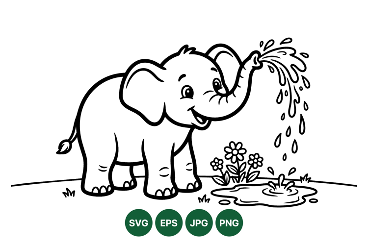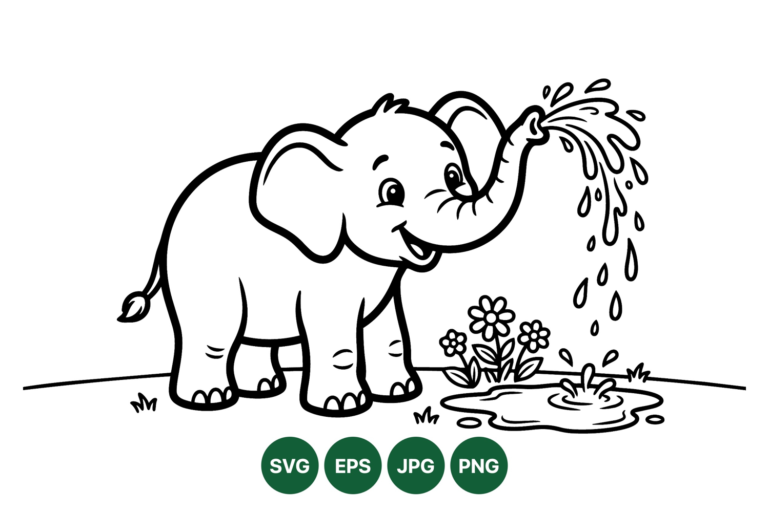 A playful baby elephant sprays water from its trunk onto a small puddle surrounded by flowers, depicted in clean black line art ideal for children books and educational materials.