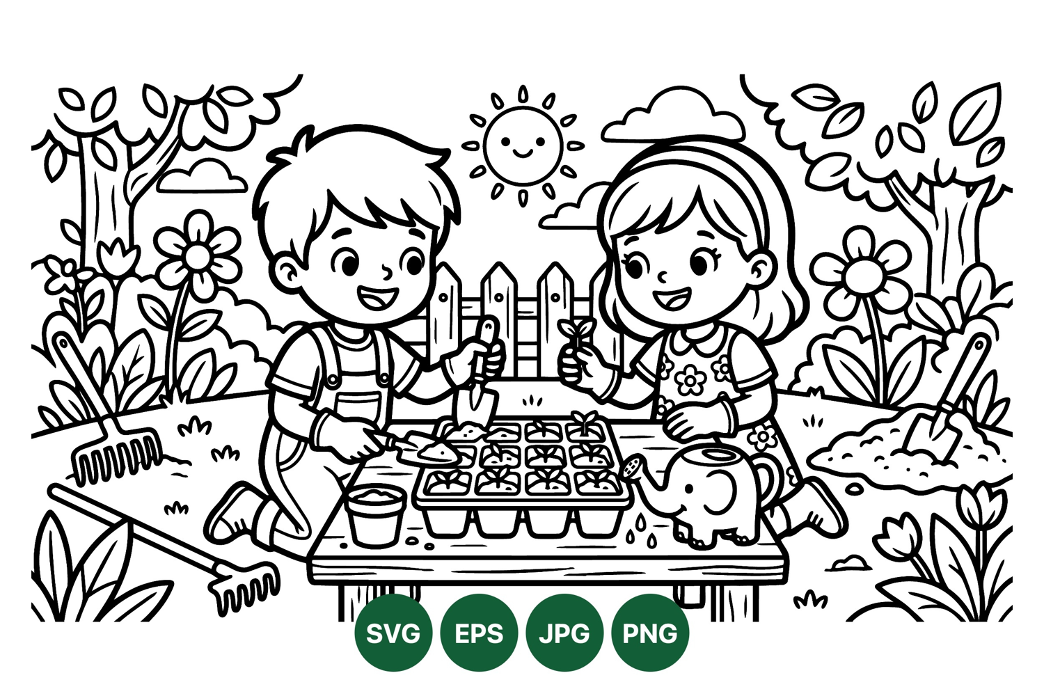 Black and White Kids Gardening Coloring Page Illustration example image 1