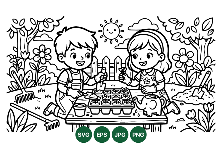 Black and White Kids Gardening Coloring Page Illustration