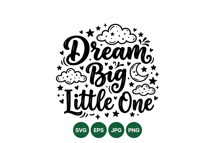 Black hand drawn lettering phrase dream big little one surrounded by whimsical stars clouds moon for nursery wall art baby decor motivational theme peaceful mood