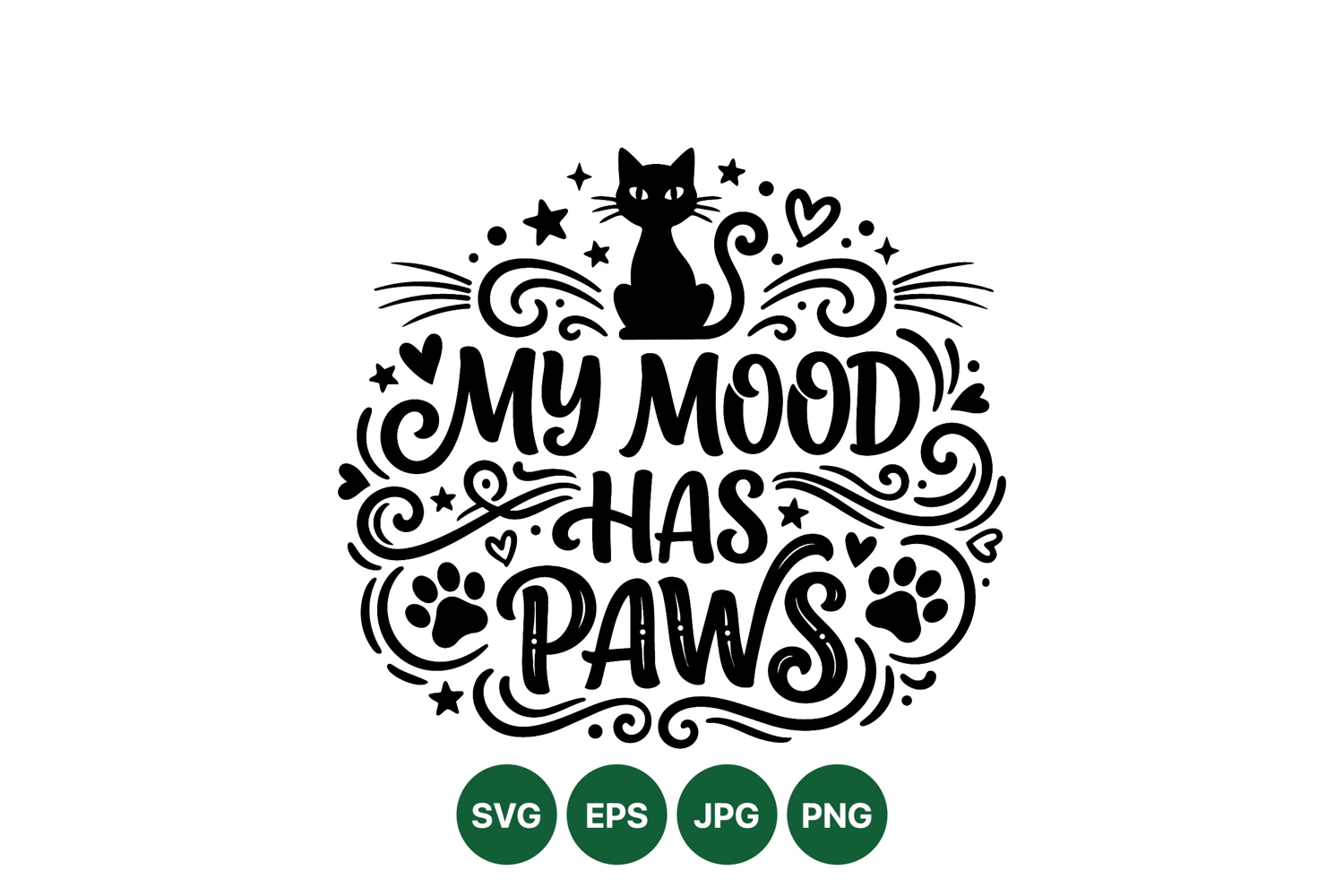Decorative black silhouette cat vector design features whimsical handwritten phrase my mood has paws surrounded by hearts stars and paw prints in playful style