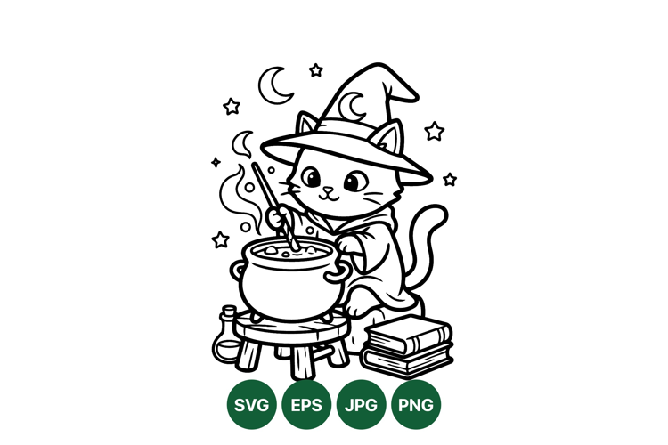 A charming black and white vector line art depicts a cat dressed as a wizard stirring a bubbling cauldron beside stacked spell books with magical stars and moons floating around the scene