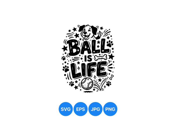 Hand drawn black and white vector illustration features a happy dog with playful typography saying ball is life surrounded by paw prints and bones in lively style