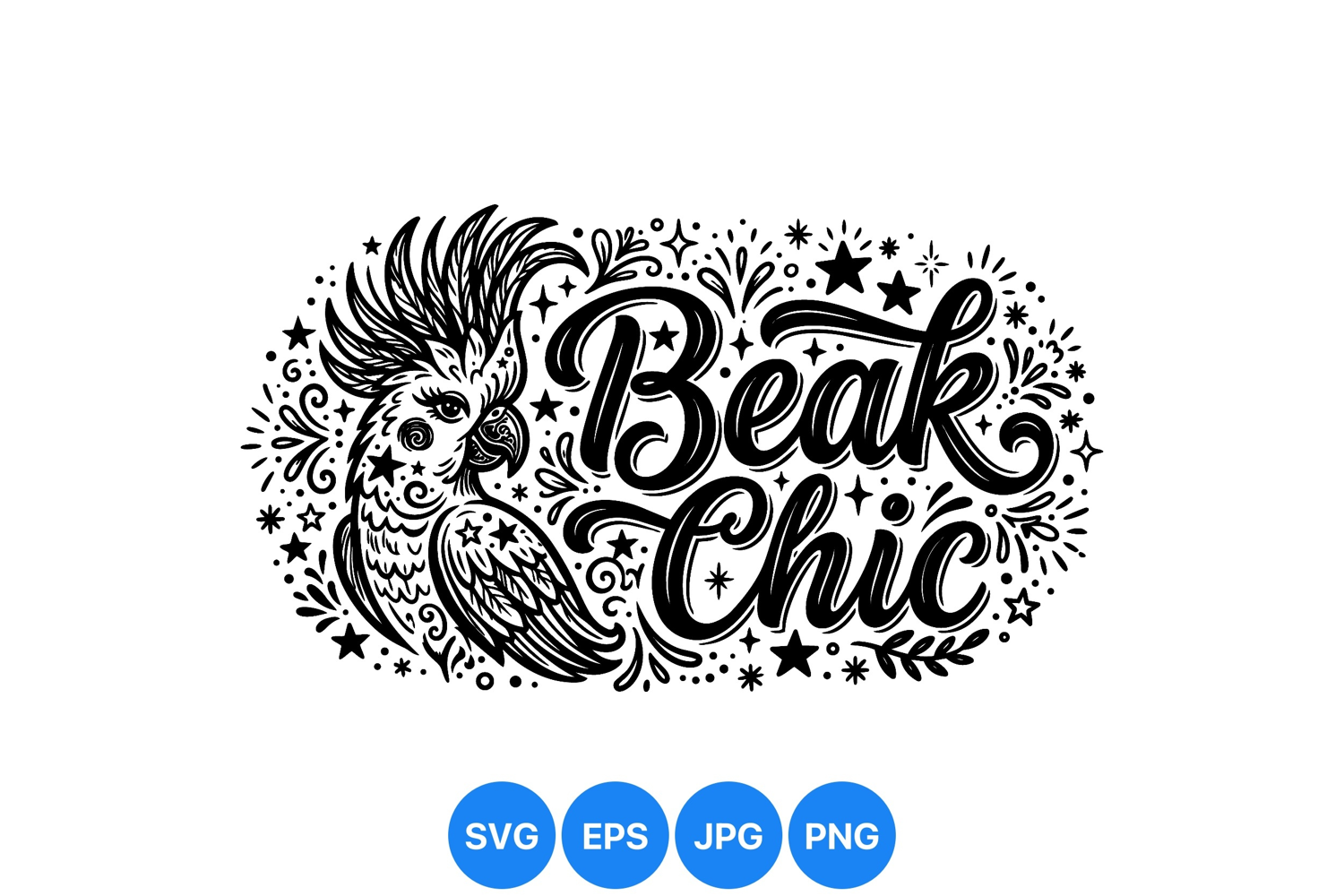 Detailed black and white illustration features a cockatoo bird surrounded by stars and ornamental foliage with stylish hand lettering spelling beak chic in vintage artistic design