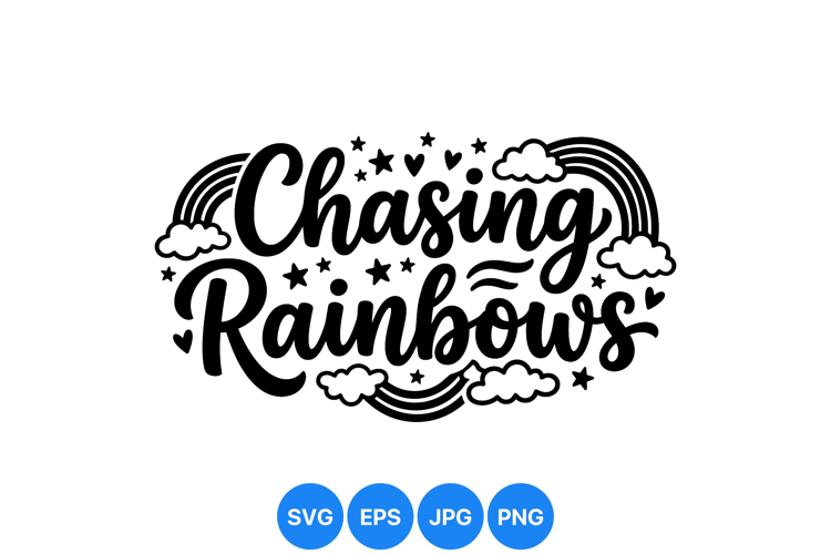 Playful hand lettering saying chasing rainbows surrounded by clouds stars and hearts in black and white style perfect for inspirational quotes and crafting projects vibrant mood